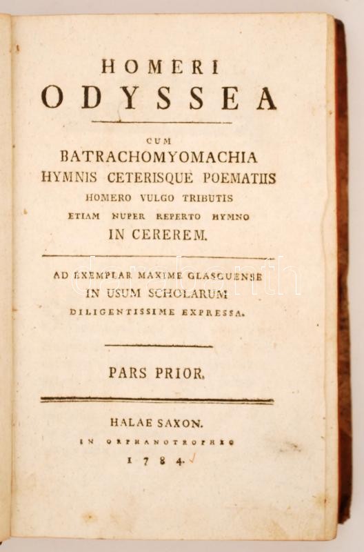 Description: Homeri Odyssea cum Batrachomyomachia hymnis ceterisque poematiis Homero vulgo tributis. I-II kötet egybekötve. Halle an der Saale, 1784. Viseltes korabeli félbőrkötésben.