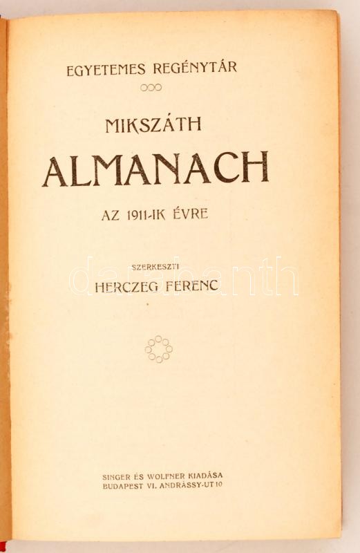 https://www.darabanth.com/en/252-Online-auction/252.0/Other-collectibles/Books-Other-rarities~800034/Mikszath-Almanachja-1911-Szerkeszti-Herczeg-Ferenc-Bp-1911-Singer-es-Wolfner-Kiadoi-aranyoz~II1216297