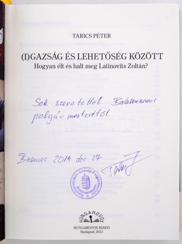 Description: Tarics Péter: (I)gazság és lehetőség között. Hogyan élt és halt meg Latinovits Zoltán? Bp., 2013, Hungarovox Kiadó. Takács József balatonszemesi polgármester dedikációjával és hivatali bélyegzőjével. Kartonált papírkötésben, jó állapotban.
