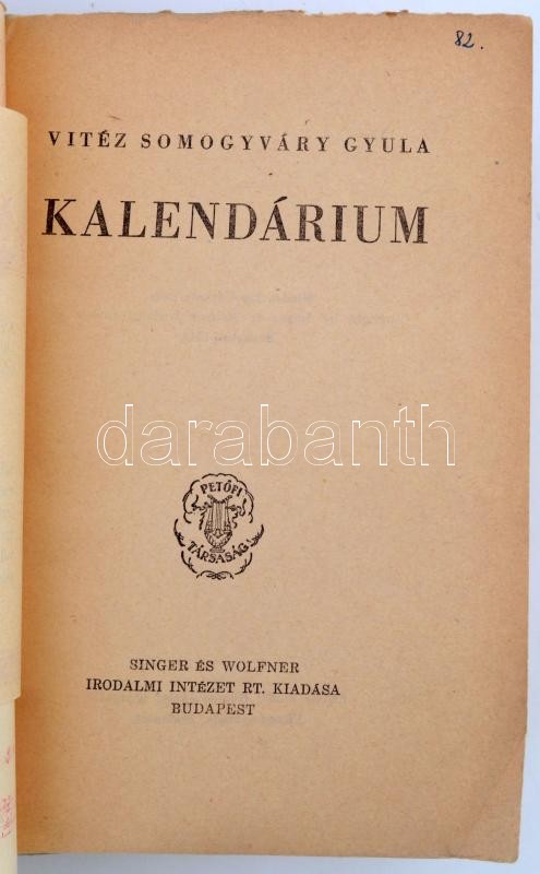 Description: vitéz Somogyváry Gyula: Kalendárium. Bp., 1943, Singer és Wolfner. 222 p. Fűzve, kiadói papírborítóban. A Petőfi Társaság kitöltetlen ajándékszelvényével.