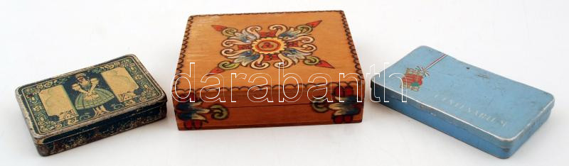 3 db régi cigarettás doboz, 2 db fém, 1 db fa, kopottak, 10x7x2 cm, 11...