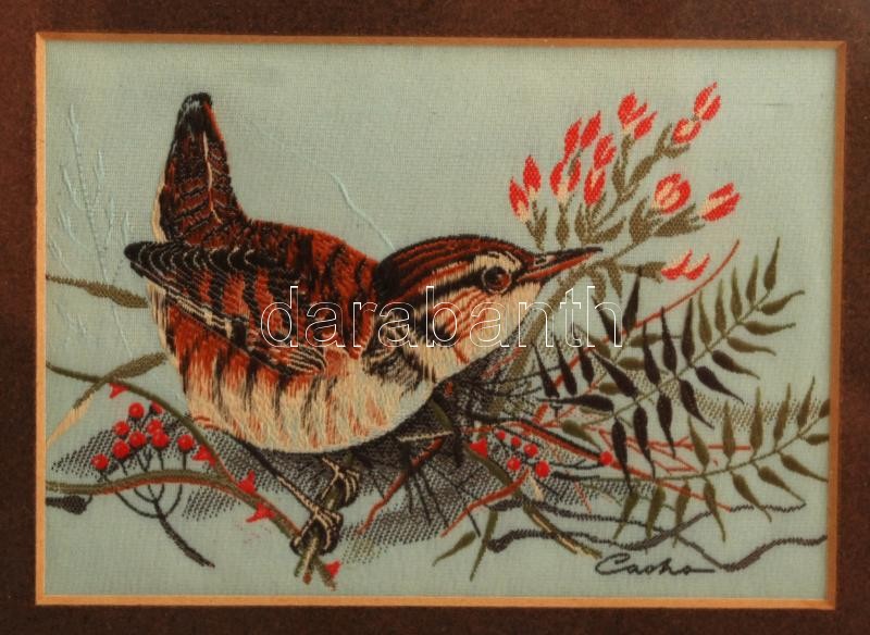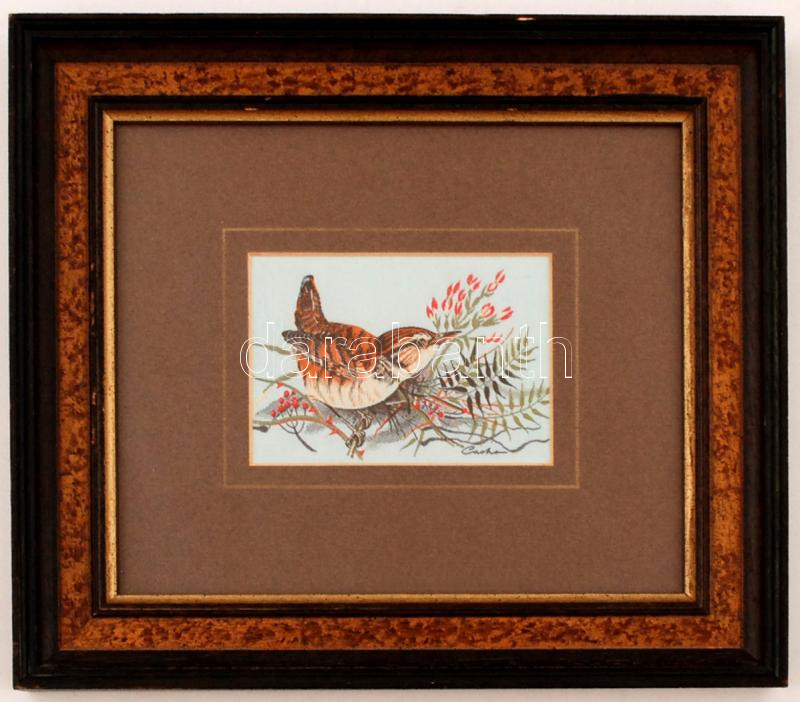 Cash angol finoman kidolgozott gobelin kép, paszpartuban, üvegezett fa keretben, 7×10 cm