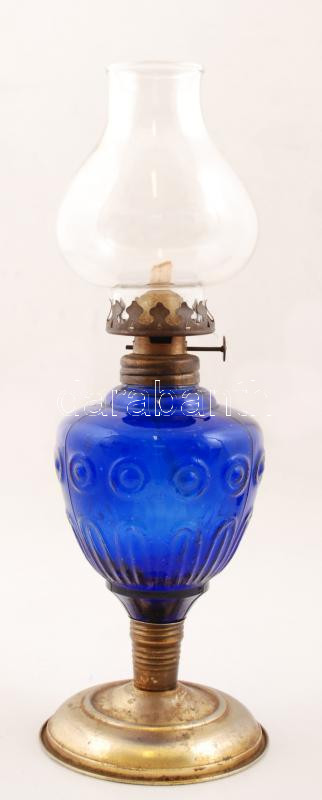 Kék üvegtestű fém talpas petróleumlámpa, m: 36 cm