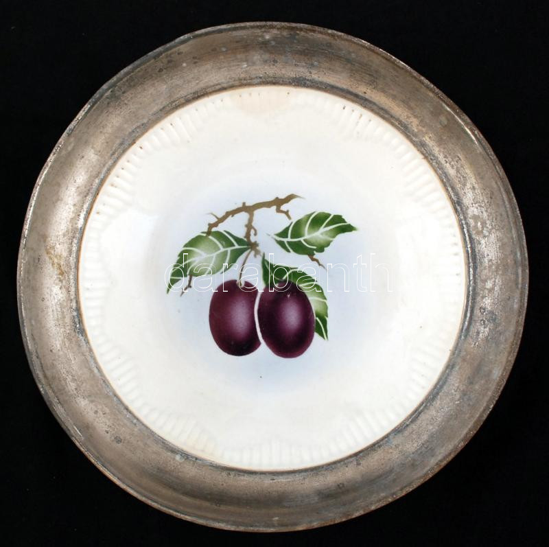 Régi fém peremes porcelán mély tányér, matricás, jelzés nélkül, d:22 c...