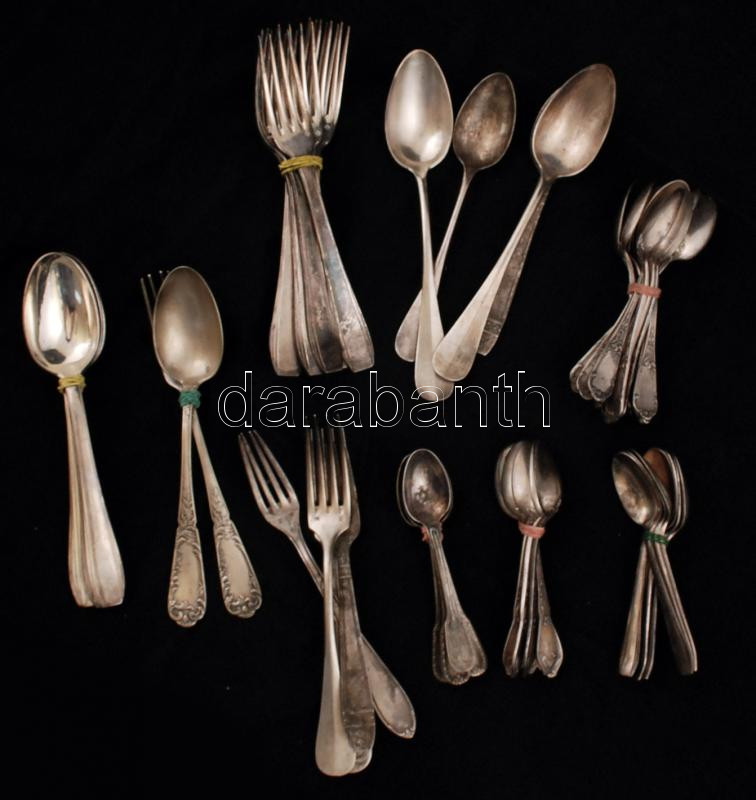 Vegyes, ezüstözött alpakka evőeszközök, többnyire jelzettek, cca 50db