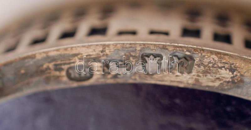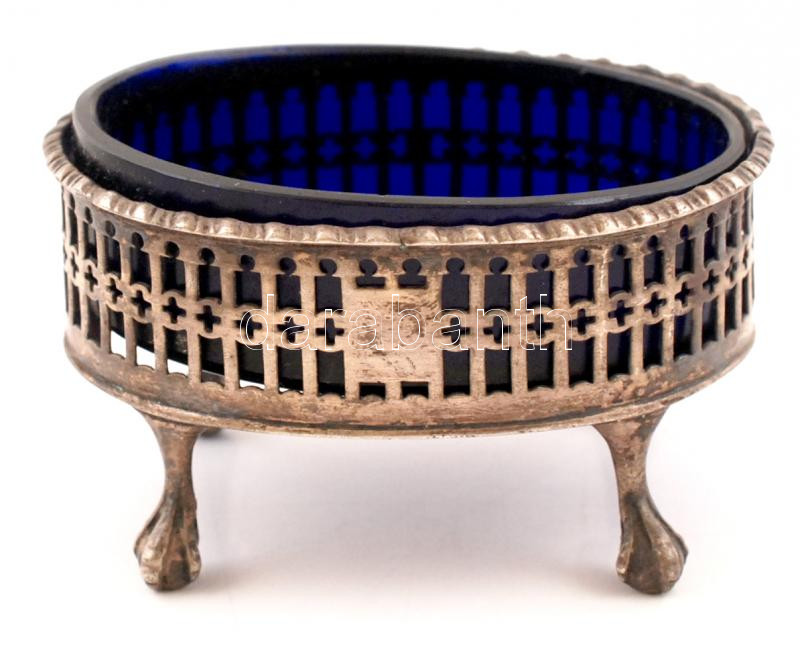 Ezüst(Ag) sótartó kék üvegbetéttel(rajta apró csorbával), jelzett, 56,1 g