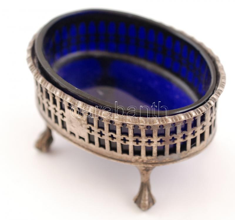Ezüst(Ag) sótartó kék üvegbetéttel(rajta apró csorbával), jelzett, 56,...