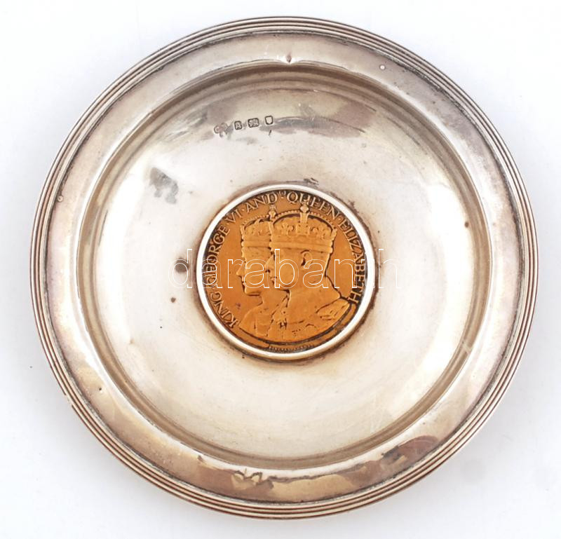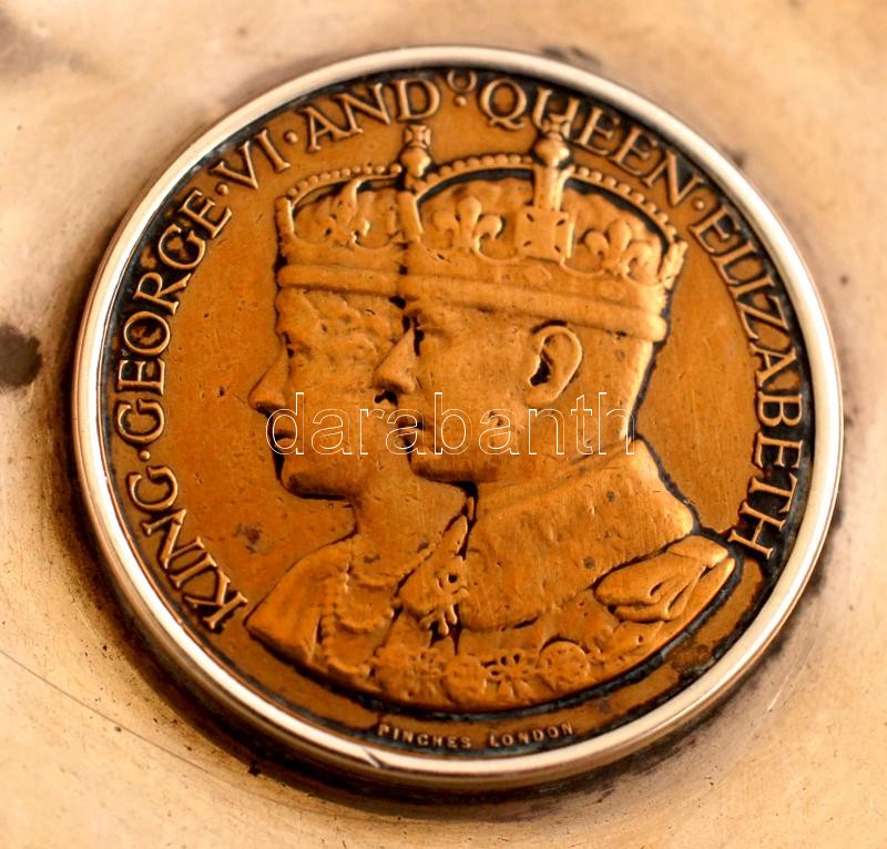 VI. György angol királyt és Erzsébet királynőt ábrázoló koronázási emlékmedál ezüst(Ag) tálba foglalva, jelzett, br: 62,8 g