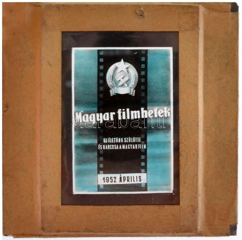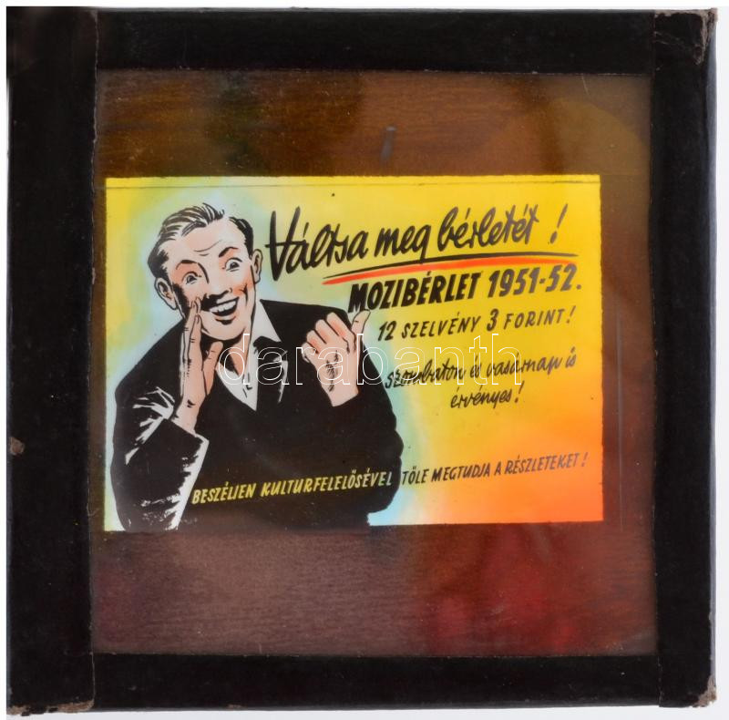 Description: cca 1940 Fekete György (1904-1990) budapesti fényképész specialitása a mozikban nagyfilmek előtt vetített álló diapozitív reklámképek voltak, ez az összeállítás a mozival kapcsolatos reklámokat, tájékoztatókat tartalmazza, 13 db diapozitív kép üveglemezen, néhány színezett, 8x8 cm és 6x5 cm között
