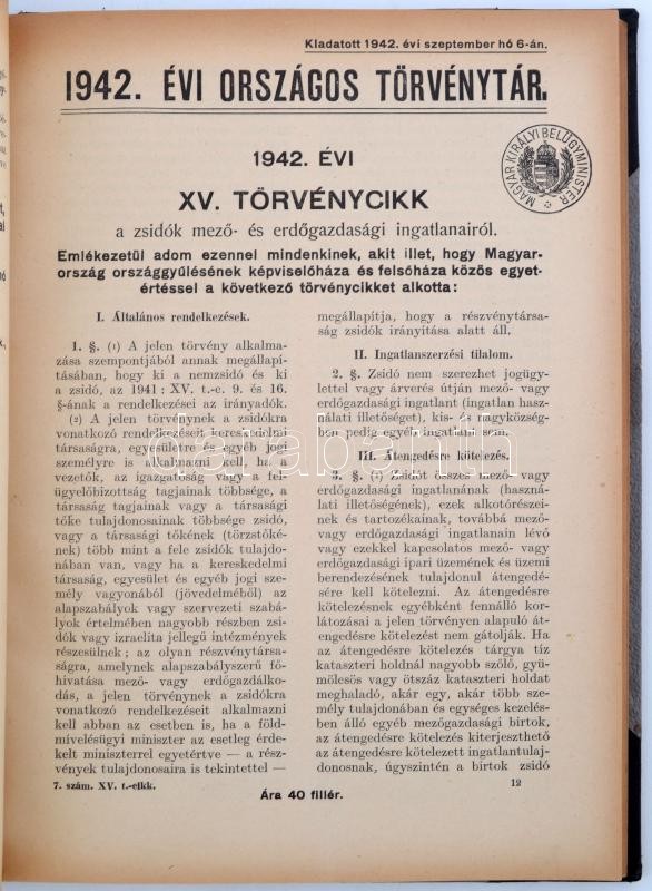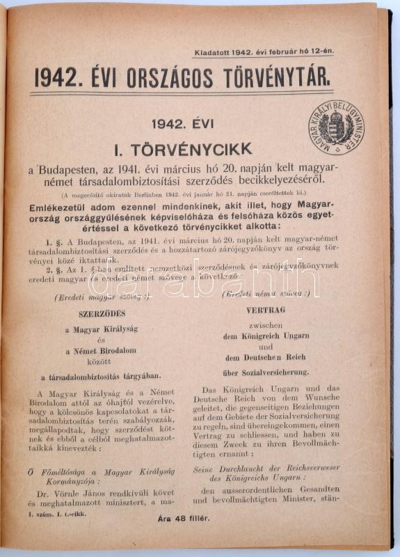 1942. évi Országos Törvénytár (Corpus Iuris). Budapest, 1942, Stádium....