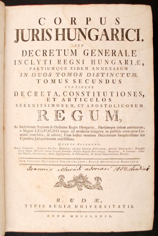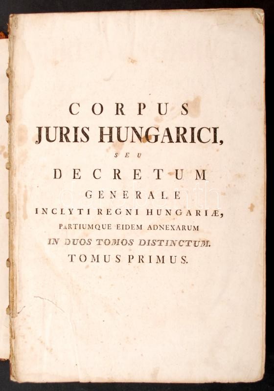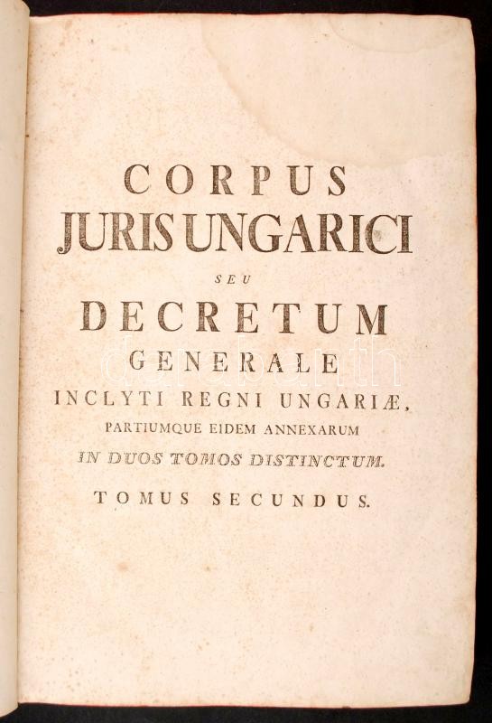 Corpus juris Hungarici seu decretum generale inclyti regni Hungariae partiumque eidem annexarum in duos tomos distinctum. Buda, 1779, typis regiae universitatis. 1-2.köt. Kopott bőrkötésben, kissé foltos lapokkal, az első kötet elő- és hátlapja elválik, a szennylap kijár.