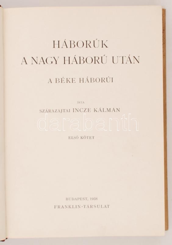 Incze Kálmán: Háborúk a nagy háború után. A béke háborúi. 1-2. köt. Bp., 1938, Franklin. Kissé kopott félbőr kötésben, egyébként jó állapotban. + Világpolitikai és háborús események. 1938 szeptemberétől 1939 júliusáig. Függelék szárazajtai Incze Kálmán Háborúk a nagy háború után. (A béke háborúi.) c. kétkötetes művéhez. Bp., 1939, Franklin. Papírkötésben, jó állapotban, 32 p.