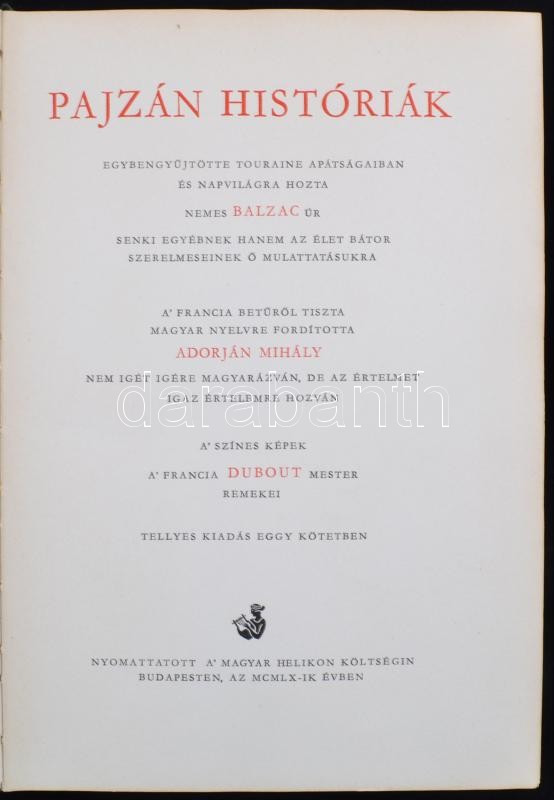 Balzac: Pajzán históriák. Egybengyűjtötte Touraine apátságaiban és napvilágra hozta nemes - - úr. A' francia betűről tiszta magyar nyelvre fordította Adorján Mihály. A' színes képek a' francia Dubout mester remekei. Nyomtattatott A' Magyar Helikon költségin Budapesten, az MCMLX-ik évben. Sorszámozott 357. példány! Kiadói félbőr kötésben.
