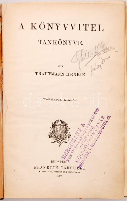 https://www.darabanth.com/en/253-Online-auction/253.0/Books-Maps-Printed-materials/Books-Other-rarities~400032/Trautmann-Henrik-A-konyvvitel-tankonyve-Bp-1900-Franklin-Kicsit-laza-kopott-felvaszon-ko~II1204619