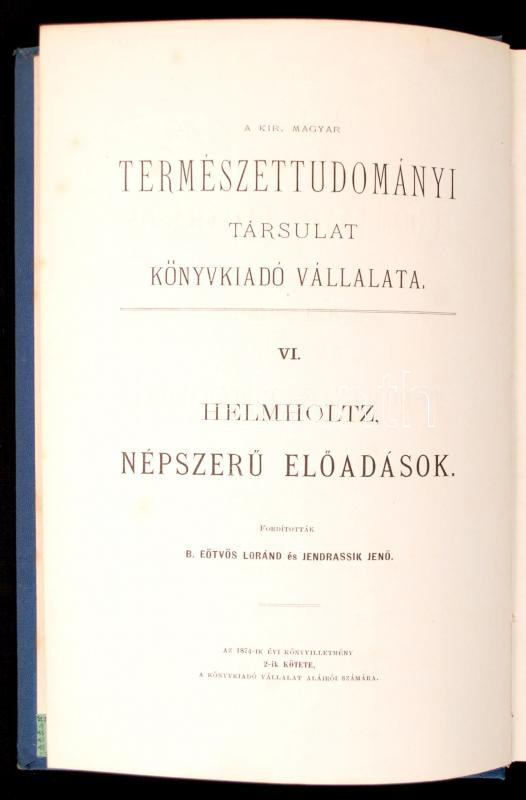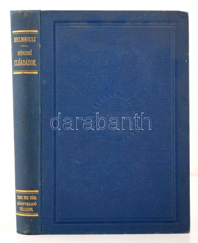 Helmholtz, H.: Népszerű tudományos előadások. Bp., 1874, Királyi Magyar Természettudományi Társulat (A Kir. Magyar Természettudományi Társulat Könyvkiadó Vállalata 6.). Kicsit kopott vászonkötésben, egyébként jó állapotban.