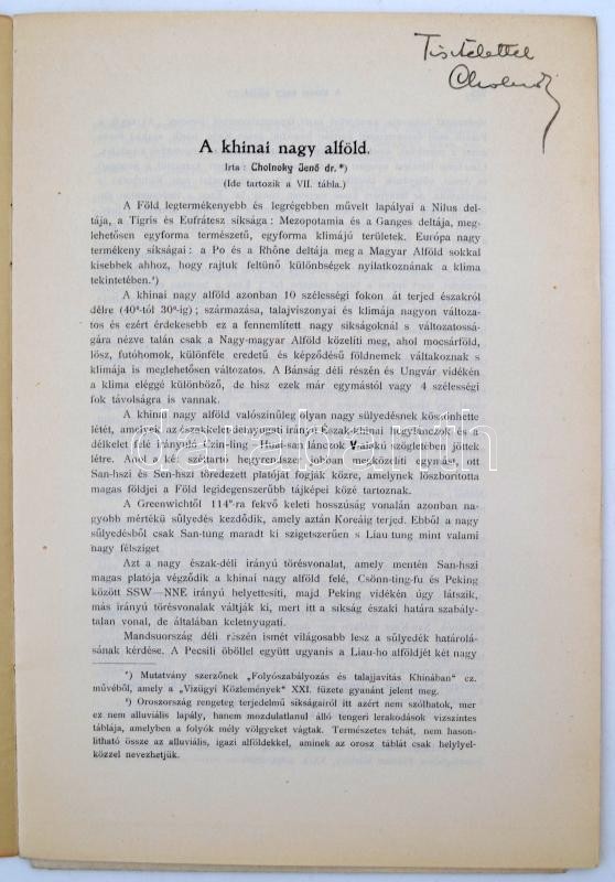 Description: 1905 Cholnoky Jenő: A kínai nagyalföld, térkép melléklettel. Különlenyomat a "Földrajzi Közlemények" 1905. XXXIII. kötet, VI. füzetéből. Szerző által dedikált példány! 24x16cm