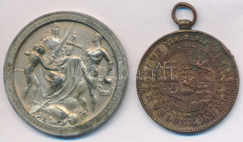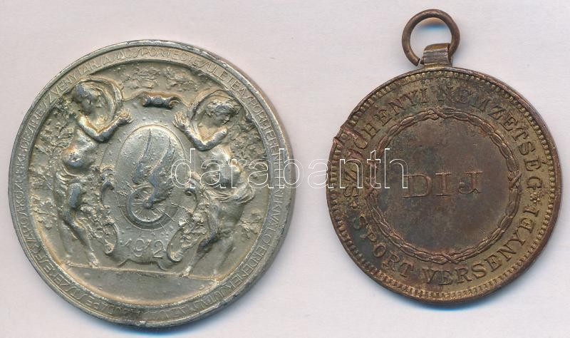 Description: 1912. "Budapest Székesfővárosi Közlekedési Részvénytársaság Sportegyesülete A Sport Terén Elért Kiváló Érdemek Jutalmazására" fém díjérem (40mm) + ~1920-1930. "Széchenyi Nemzetség Sportversenyei - DIJ / Ha Isten velünk, ki ellenünk" Br díjérem (35mm) T:2-,3 ph., patina