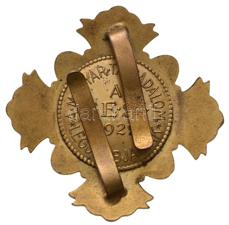 1929. "A Magyar Társadalom Legjobbjainak - A T.E.SZ. 1929" a Társadalmi Egyesületek Szövetségének kitüntetése, nemzetiszínű zománcozással díszített kereszt, közepén angyalos magyar címer díszítménnyel, hátoldalon szöveggel és két rögzítőpánttal ellátva, "BOCZÁN GY. BUDAPEST VII. RÁKÓCZI ÚT 6." gyártói jelzéssel (54,5mm) T:2 Hungary 1929. "Society's Finest" enamelled decoration of the League of the Social Associations, with maker's mark "BOCZÁN GY. BUDAPEST VII. RÁKÓCZI ÚT 6." (54,5mm) C:XF