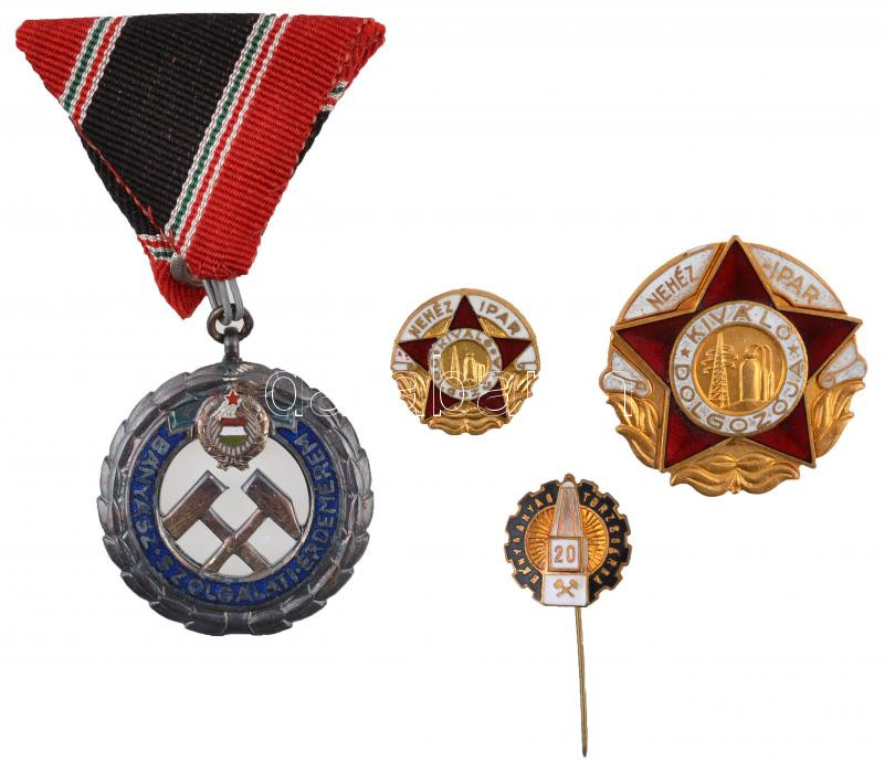 ~1960. "Nehézipar Kiváló Dolgozója" zománcozott, aranyozott fém kitüntetés miniatűrrel, adományozói tokban + "Bányaanyag Törzsgárda - 20" zománcozott tombak jelvény + 1965. "Bányász Szolgálati Érdemérem" ezüst fokozata, ezüstözött fém kitüntetés mellszalagon, tokban T:2
