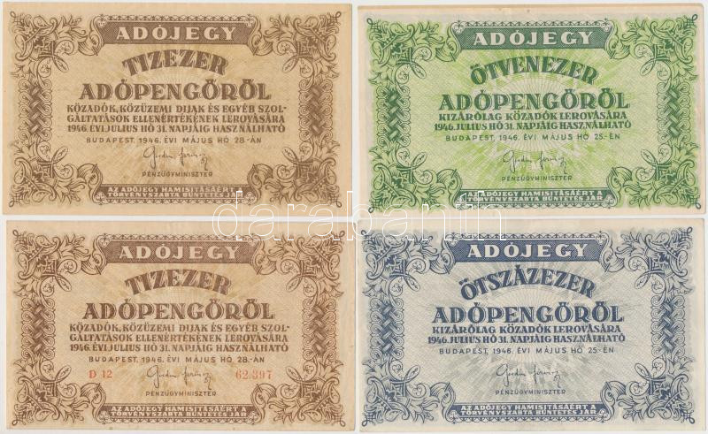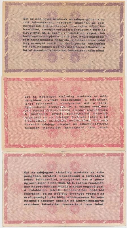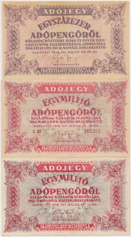 1946. 10.000AP (2x) + 50.000AP + 100.000AP + 500.000AP + 1.000.000AP (2x), egyik fordított címerrel és "amelyeknek" hibás hátlapi szöveggel T:II-,III