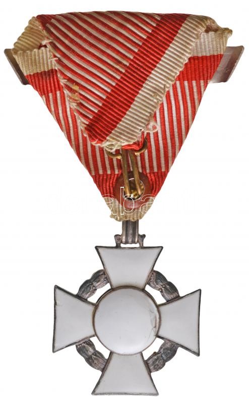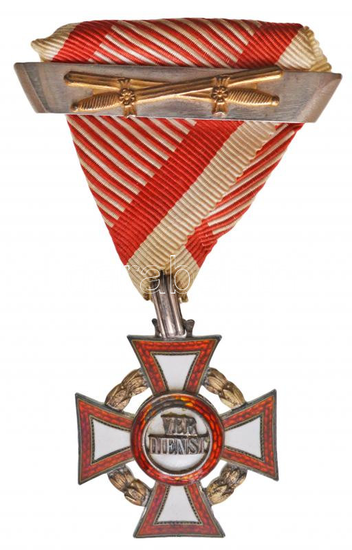 1916-1918. "A Katonai Érdemkereszt III. Osztálya hadidíszítménnyel és kardokkal, ismételt adományozás" zománcozott kitüntetés javított mellszalagon, sérült ismétlőpánttal T:2,2- zománchiány és hiba Hungary 1916-1918. "Military Merit Cross, 3rd Class, with a war decoration and swords, with second-award bar" enamelled decoration on fixed ribbon, with damaged strap C:XF,VF enamel missing and error NMK 179.