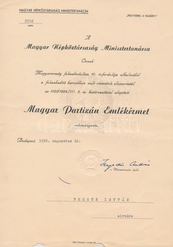 https://www.darabanth.com/en/253-Online-auction/253.0/Numismatics/Military~200015/1956-Magyar-Partizan-Emlekerem-adomanyozoi-okirata-alairassal-es-szarazpecsettel-TIII~II1228423