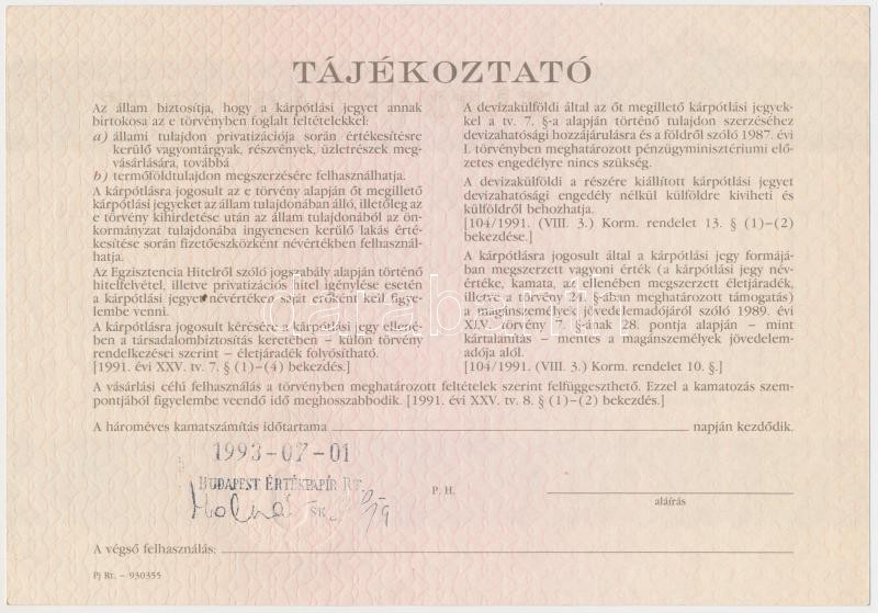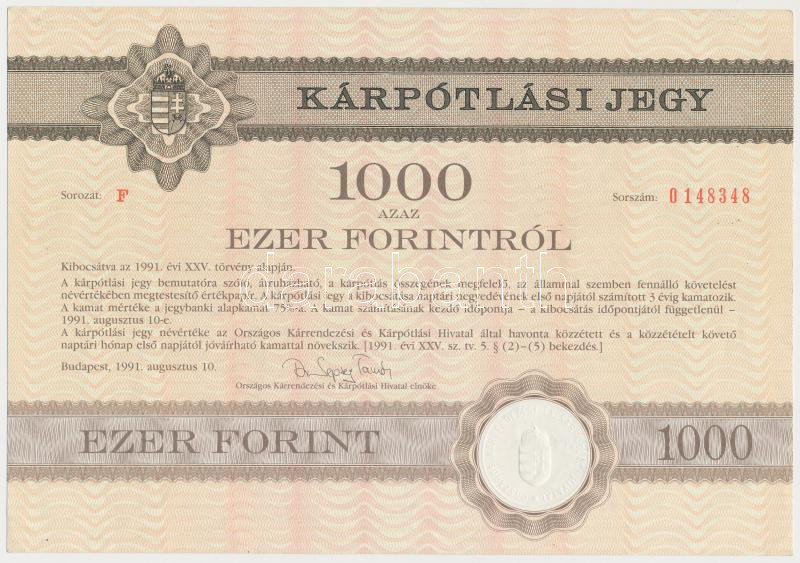 Budapest 1991. "Országos Kárrendezési és Kárpótlási Hivatal" kárpótlási jegye 1000Ft-ról, "F" sorozat T:I-