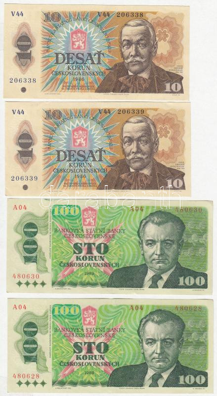 Czechoslovakia 1986. 10 Korun (2x) sequential serials + 1989. 100 Korun (2x) close serials C:AU,XF,VF