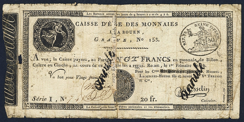 Franciaország / Rouen 1797-1803. 20Fr korabeli papírral saját idejében... https://www.darabanth.com/en/253-Online-auction/253.0/Numismatics/Worldwide-banknotes~200011/Franciaorszag-Rouen-1797-1803-20Fr-korabeli-papirral-sajat-idejeben-restauralt-peldany-a~II187692