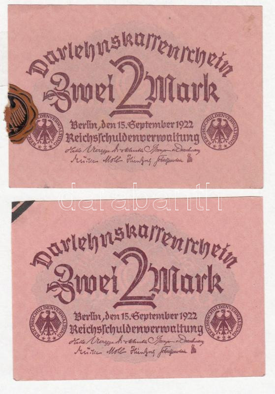 Germany / Weimar Republic 1922. 2 Mark (2x) one with part of a seal left on it C:AU