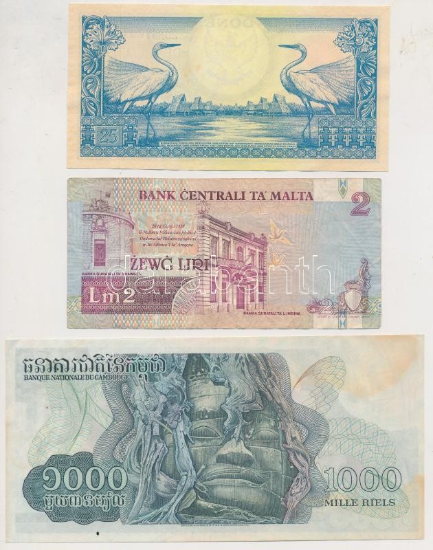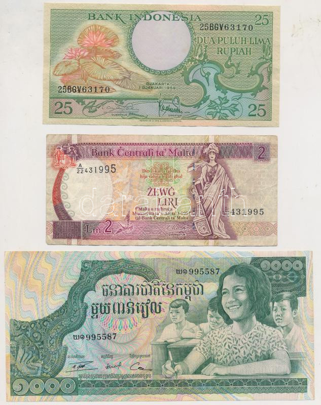 Vegyes: Indonézia 1959. 25R + Kambodzsa 1973. 1000R + Málta 1994. 2L T:I-,III
