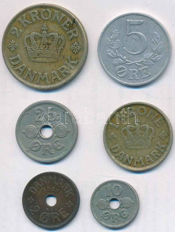 Denmark 1925. 1 Krone Al-Br + 2 Kroner Al-Br + 1928. 2 Ore Br + 1936. 25 Ore Cu-Ni + 1941. 5 Ore Al + 10 Ore Cu-Ni C:XF,VF