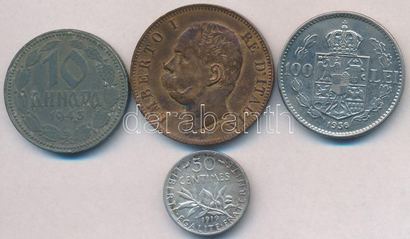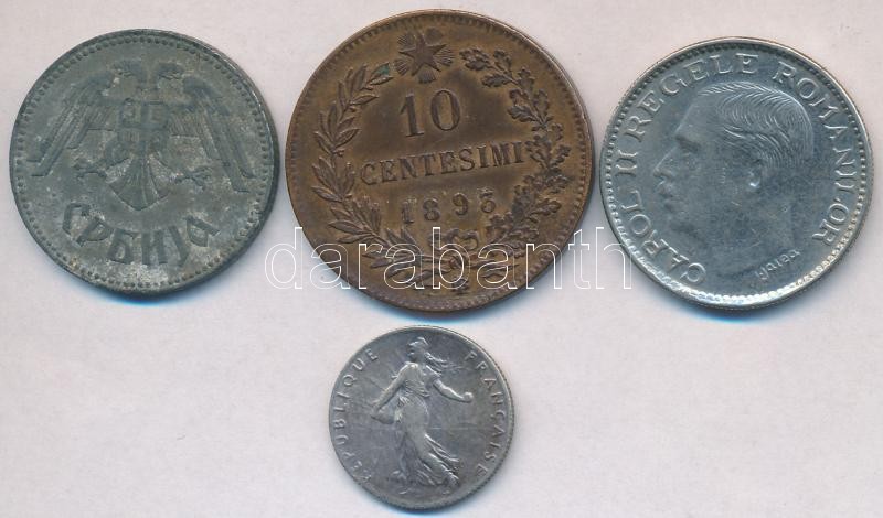 Description: Vegyes: Franciaország 1919. 50c Ag + Olaszország 1893B/l 10c Cu "I. Umberto" + Románia 1936. 100L Ni + Szerbia / Német megszállás 1943. 10D Zn T:2,2-