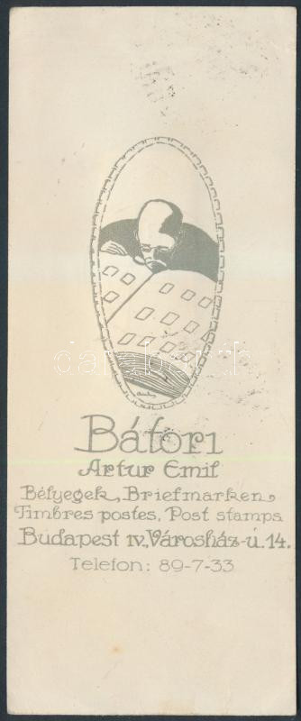 "Bátori Artúr Emil Bélyegek" reklámos számolócédula