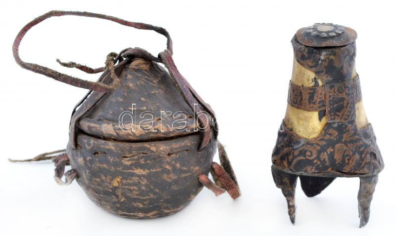Description: 2 db antik afrikai, feltehetőleg etióp használati tárgy. Bőr tartó, valamint csont és fém rátétes asztali tartó / Antique African, probably Ethiopian artifacts, made of leather, bone and metal 9x10 cm, 12 cm