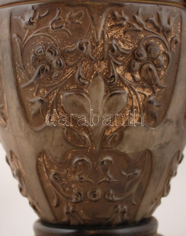 Antik növény- és állatnmotívumos festett cserép váza, jelzés nélkül, fa talapzattal, kopásnyomokkal, sérülésekkel, m: 35 cm