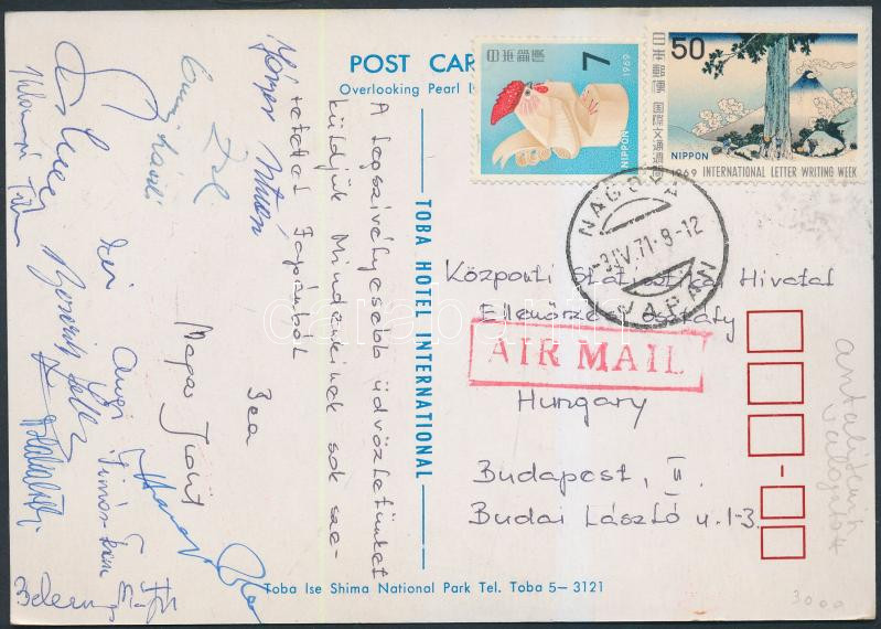 1971 A magyar asztalitenisz válogatott tagjai által aláírt és hazaküldött képeslap Japánból