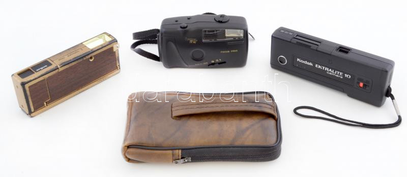3 db különféle fényképezőgép: Kodak Ektralite 10 (hozzá tartozó tokkal), Argus Mini Palmatic 2, Hama FF102