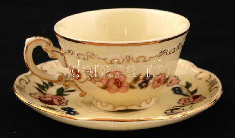 Zsolnay virágmintás porcelán mokkás csésze és alj, kézzel festett, jel...