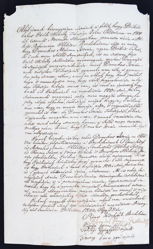 1822 Békés, magyar nyelvű tanúságlevél érdekes peres ügyben, a békési református egyház tisztviselőinek aláírásával