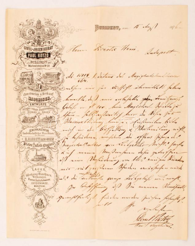 1876 Kotzó Pál üzleti levél díszes fejléces papíron, 29x22cm
