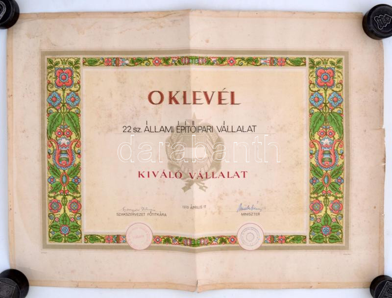 1970 Díszes oklevél a 22. sz. állami építőipari vállalat részére, Bond... https://www.darabanth.com/en/253-Online-auction/253.0/Other-collectibles/Documents~400031/1970-Diszes-oklevel-a-22-sz-allami-epitoipari-vallalat-reszere-Bondor-Jozsef-1917-1981~II1226963