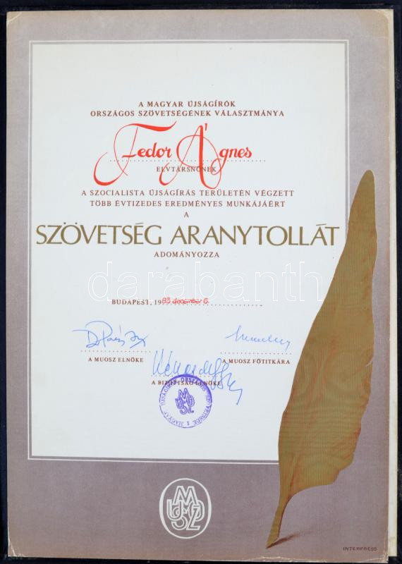 https://www.darabanth.com/en/253-Online-auction/253.0/Other-collectibles/Documents~400031/1983-Bp-A-Magyar-Ujsagirok-Orszagos-Szovetsegenek-Valasztmanya-altal-Fedor-Agnesnek-ad~II1226784