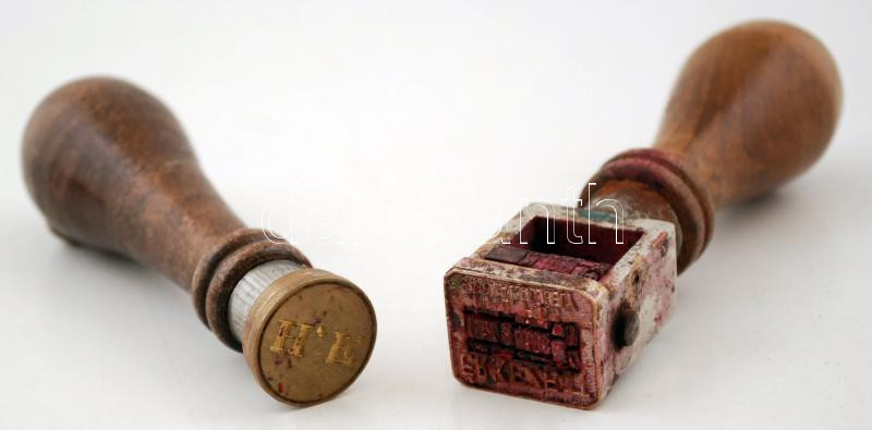 2 db pecsétnyomó: Érkezett M.N.B. Sátoraljaújhely feliratú fanyelű, fémfejű pecsétnyomó, h: 13 cm; H.F. monogramos pecsétnyomó, h: 11 cm