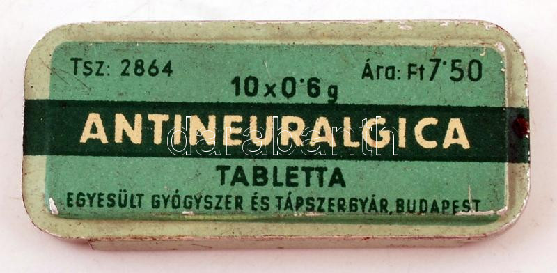 Antineuralgica tabletta, Egyesült Gyógyszer és Tápszergyár Budapest, fémdoboz, 6x2,5x0,5cm/Antineuralgica Metal medicine box, 6x2,5x0,5cm