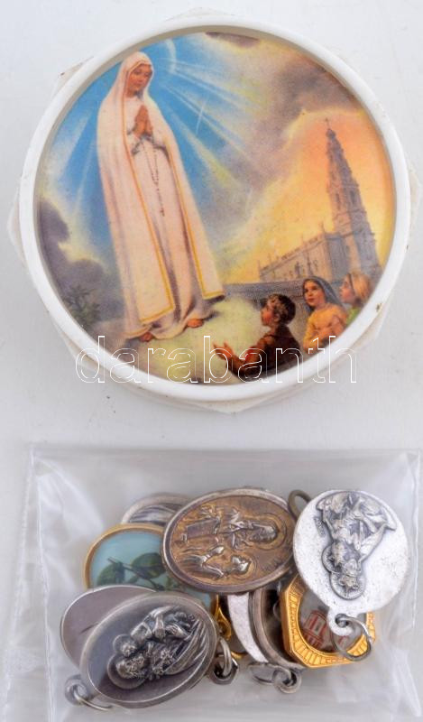 Apró kegytárgyak: 9db szenteket ábrázoló medál, 1db rózsafüzér díszdobozban