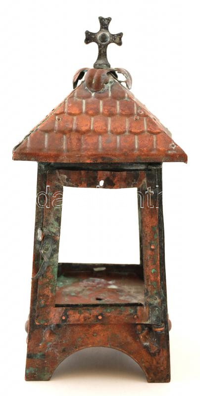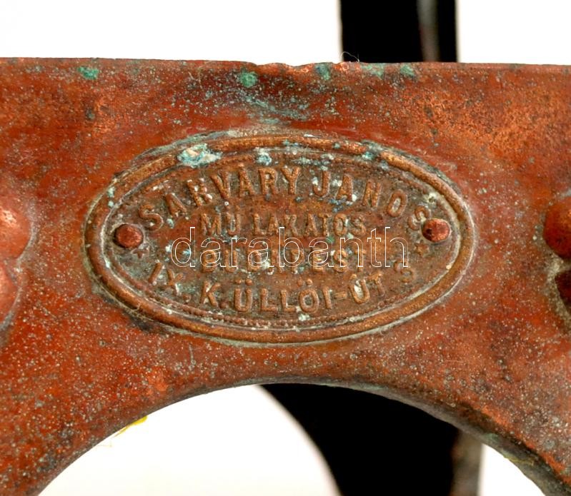 Dekoratív réz mécsestartó, üveg nélkül, "Sárváry János műlakatos, Budapest, IX. ker. Üllői út 3." felirattal, m: 30,5 cm