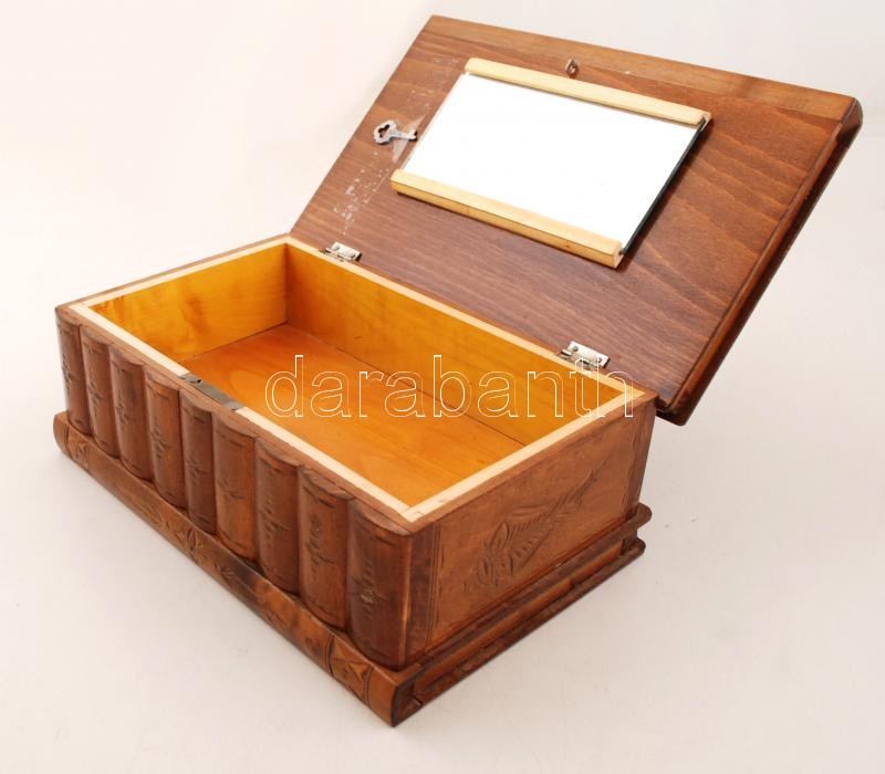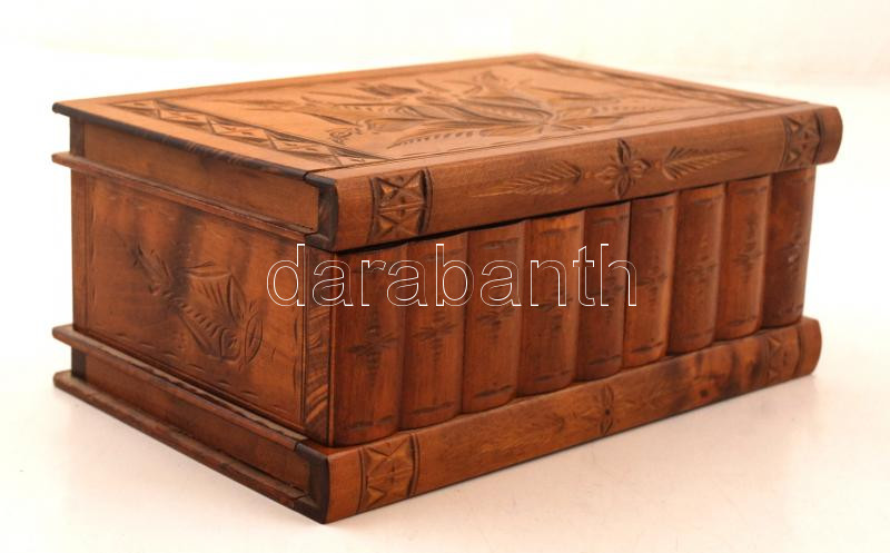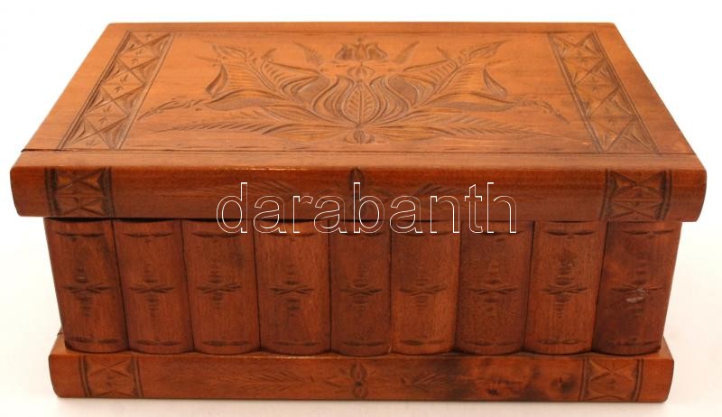 Díszesen faragott népi motívumos fa titokdoboz elrejthető zárral, titk...
