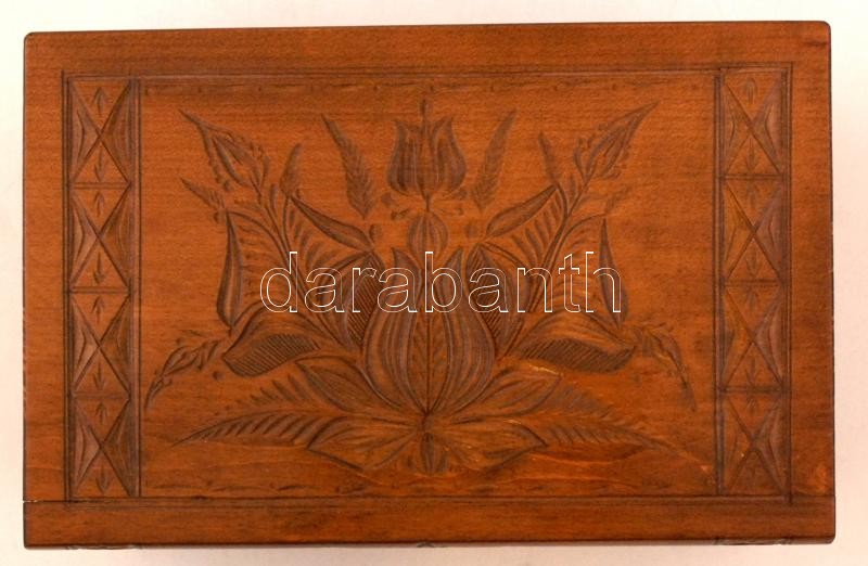 Díszesen faragott népi motívumos fa titokdoboz elrejthető zárral, titkos rekesszel, hozzá tartozó kulccsal, kicsit szorul, 17×26×11 cm