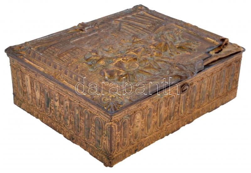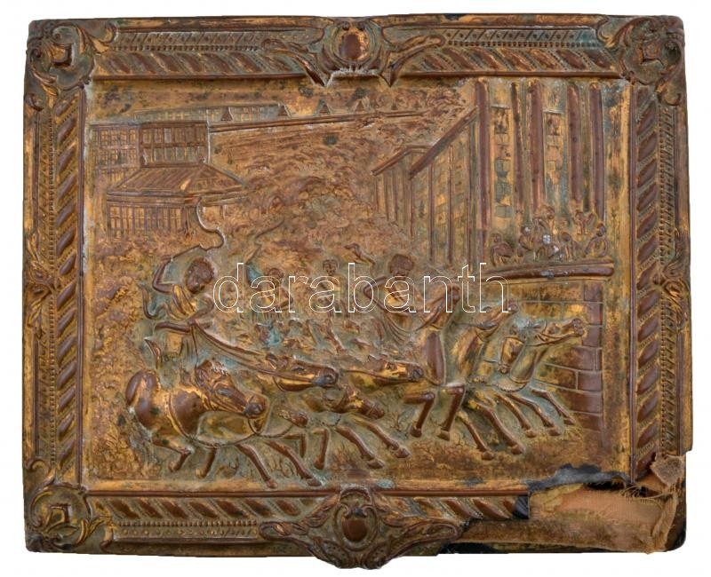 Fa berakásos, gazdagon díszített régi réz doboz, fedelén ókori kocsiverseny-jelenettel, sérült, 20,5×17×8 cm